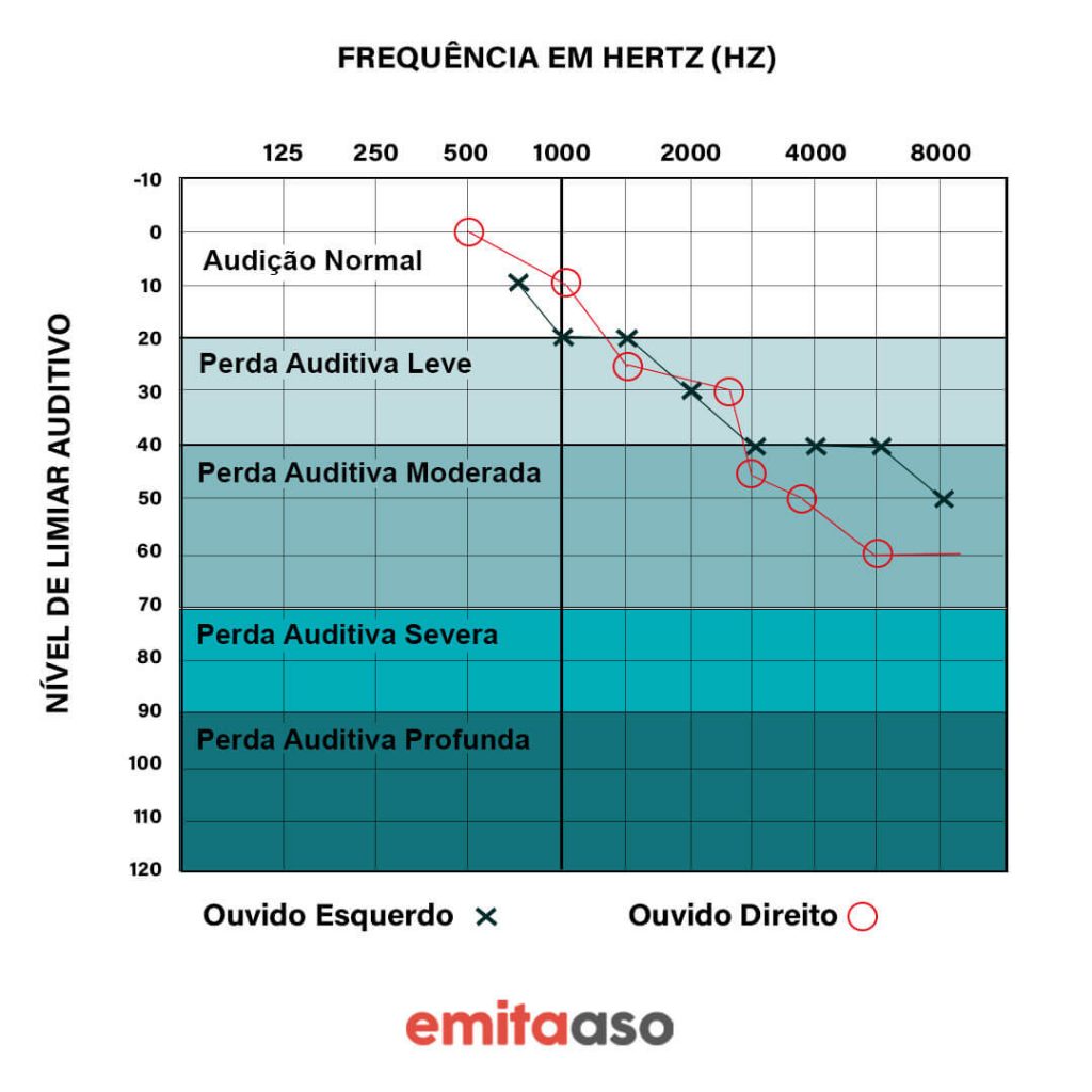 Um audiograma, um gráfico que demonstra a capacidade auditiva do paciente, apresenta os resultados de um teste de audiometria tonal e vocal. Aqui estão as interpretações típicas: